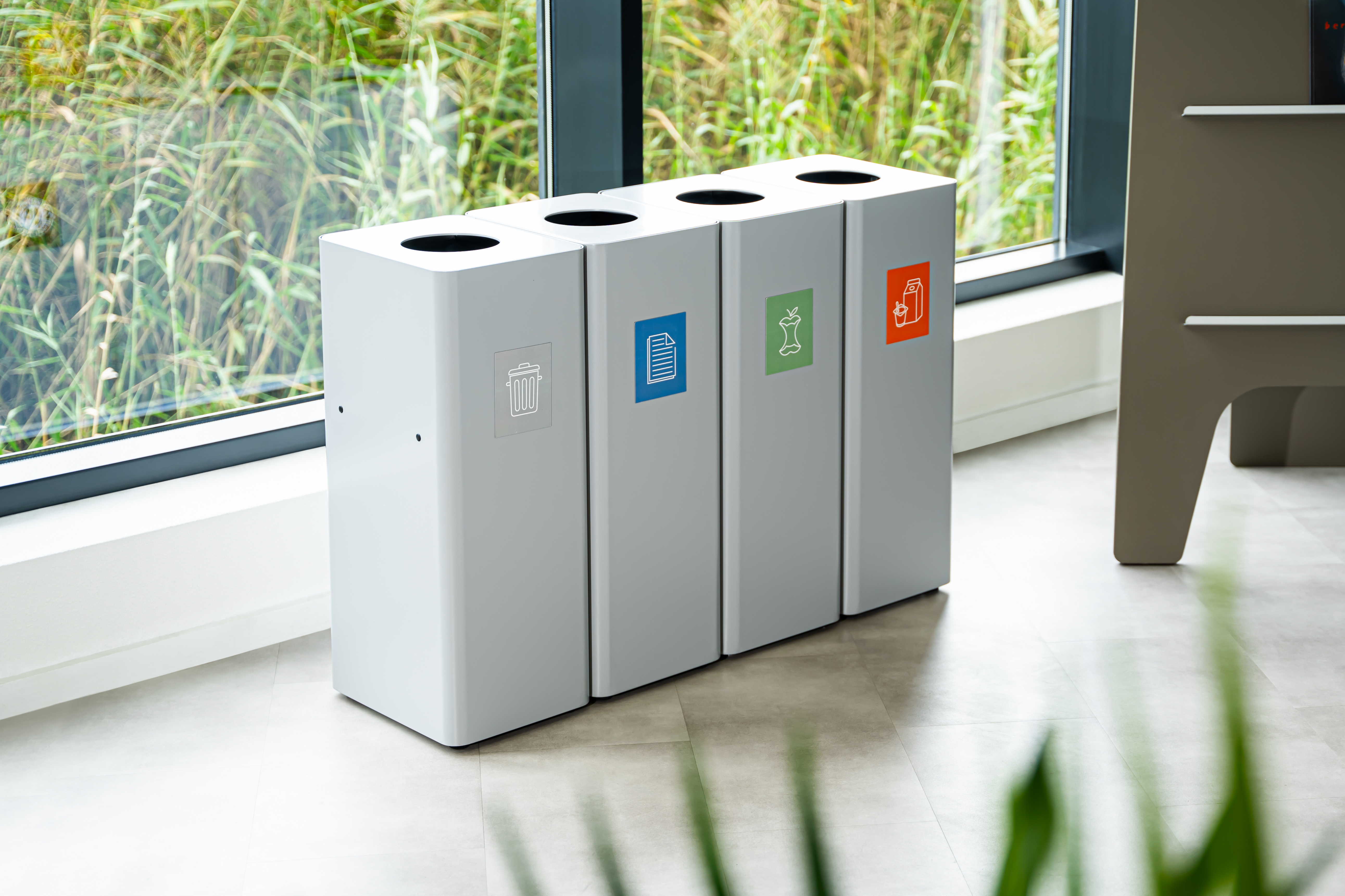 Stijlvolle metalen afvalbakken. De perfecte oplossing voor afvalscheiding op kantoor.